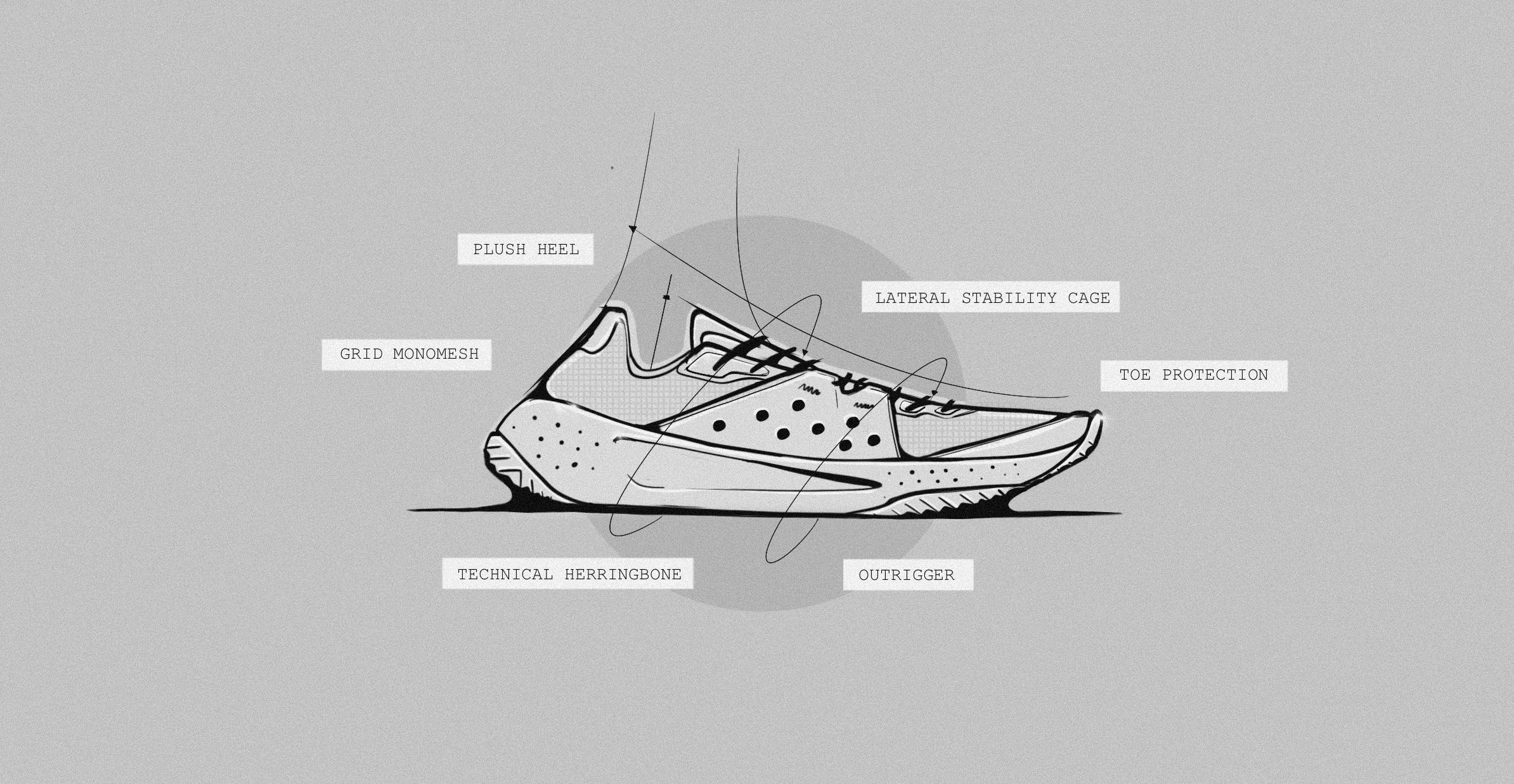 Features include a lightweight and breathable monomesh upper, lateral reinforcement cage and a dynamic herringbone outsole with strategically placed outrigger.